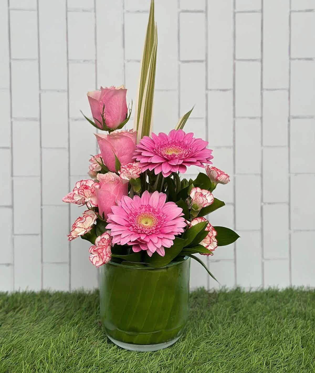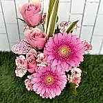 Cam Saksılı Pembe Rüya Aranjman içinde 3 adet pembe gülü, mevsimsel pembe ve kırmızı tonlarıyla ve yeşillikleriyle göze hitap eden bir aranjmandır. Altındaki cam vazo sonradan çeşitli kullanım alanlarında değerlendirilebilir.