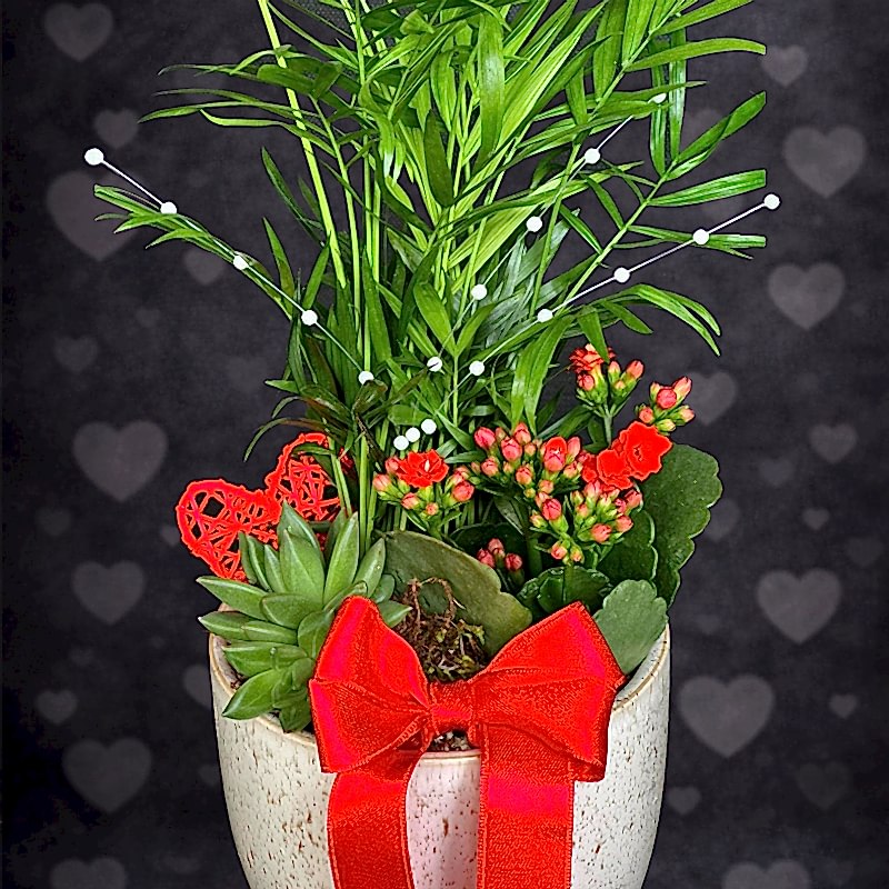 Mini Areca/Chamadorea, mini kalanchoe ve succulentler kullanılarak hazırlanan bu romantik aranjman, saksıda mini bir bahçe sunuyor.