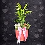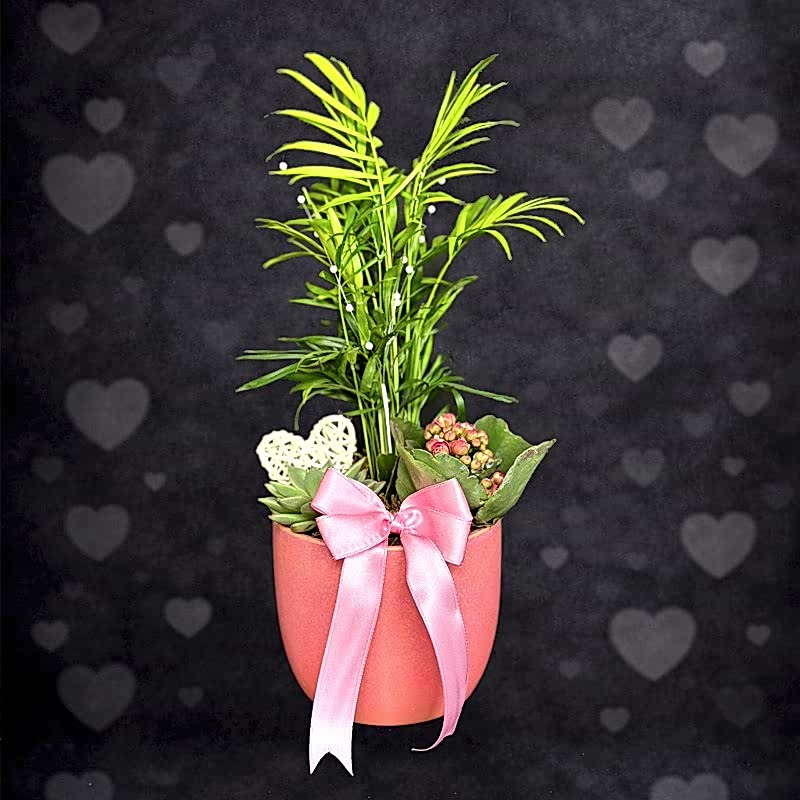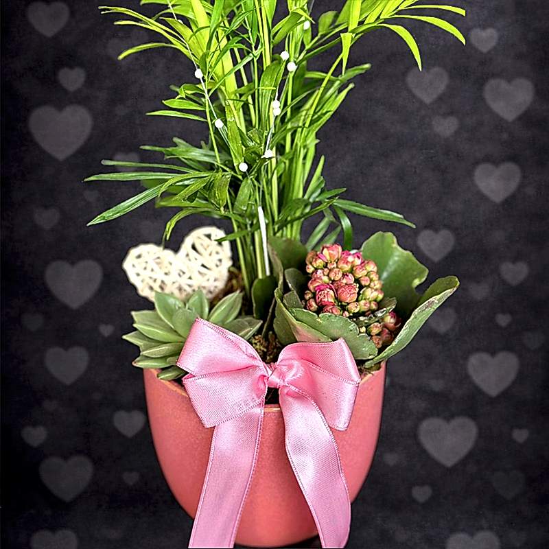 Mini Areca/Chamadorea, mini kalanchoe ve succulentler kullanılarak hazırlanan bu romantik aranjman, saksıda mini bir bahçe sunuyor.