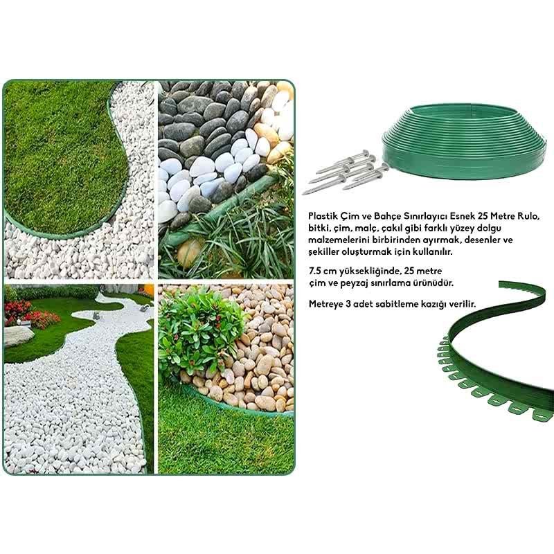 Çim alanı ile ve diğer bahçe unsurlarından mükemmel şekilde ayırır. Plastik kazıklar sayesinde zeminden çıkmaz ve uygulaması kolaydır. Ek ürün gerektirmez. İstenilen yerden kesilebilir. Plastik Çim Ayracı, bitki, çim, malç, çakıl gibi farklı yüzey dolgu malzemelerini birbirinden ayırmak, desenler ve şekiller oluşturmak için kullanılır. 1 metreye 3 adet sabitleme kazığı gönderilir.